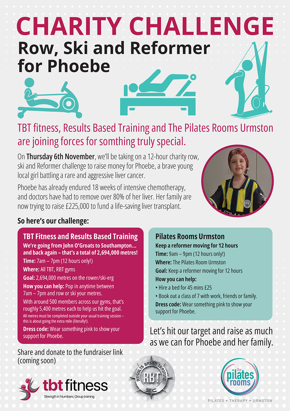 On Thursday 6th November, we’ll be taking on a 12-hour charity row, ski and Reformer challenge to raise money for Phoebe, a brave young local girl battling a rare and aggressive liver cancer. Phoebe has already endured 18 weeks of intensive chemotherapy, and doctors have had to remove over 80% of her liver. Her family are now trying to raise £225,000 to fund a life-saving liver transplant.